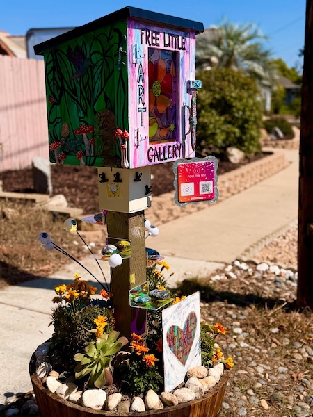 Several years ago, Kristal was inspired by the concept of the Little Free Library, where you take and share books from tiny libraries in front of homes. But she fancies herself more of an artist than a bibliophile, so she decided to build Clairemont’s smallest art gallery.