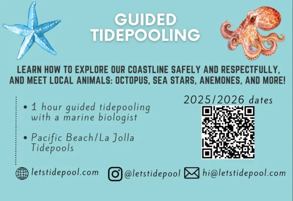 Let’s Tidepool is run by a local marine biologist who lives locally in Bay Ho, and we host guided tidepooling sessions – group and private – in Pacific Beach. Let me show you how to respectfully find the coolest critters and tell you about what makes our ocean neighbors so awesome.